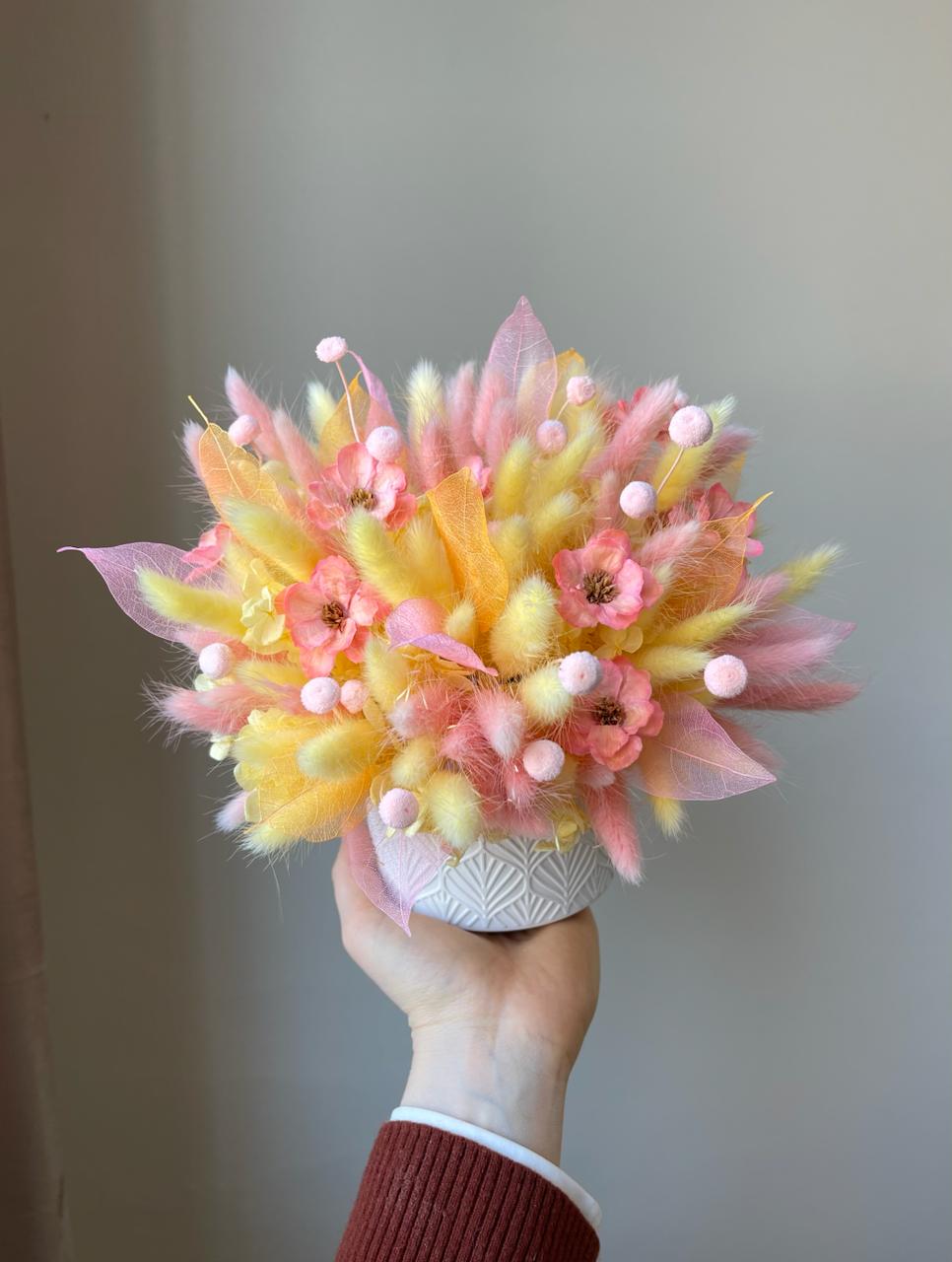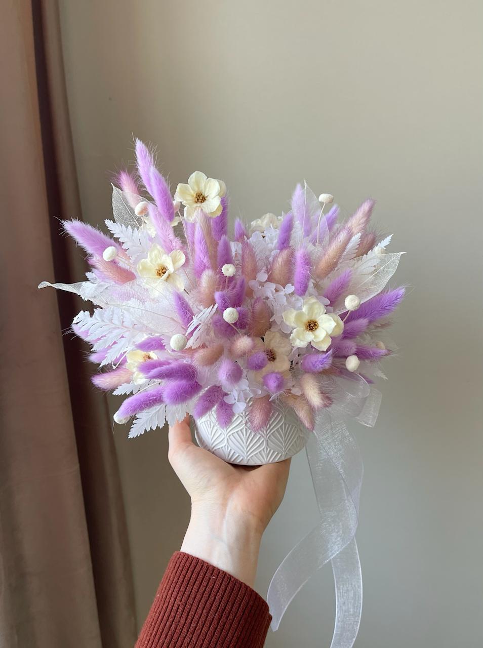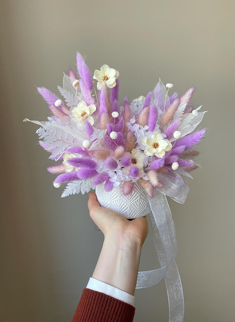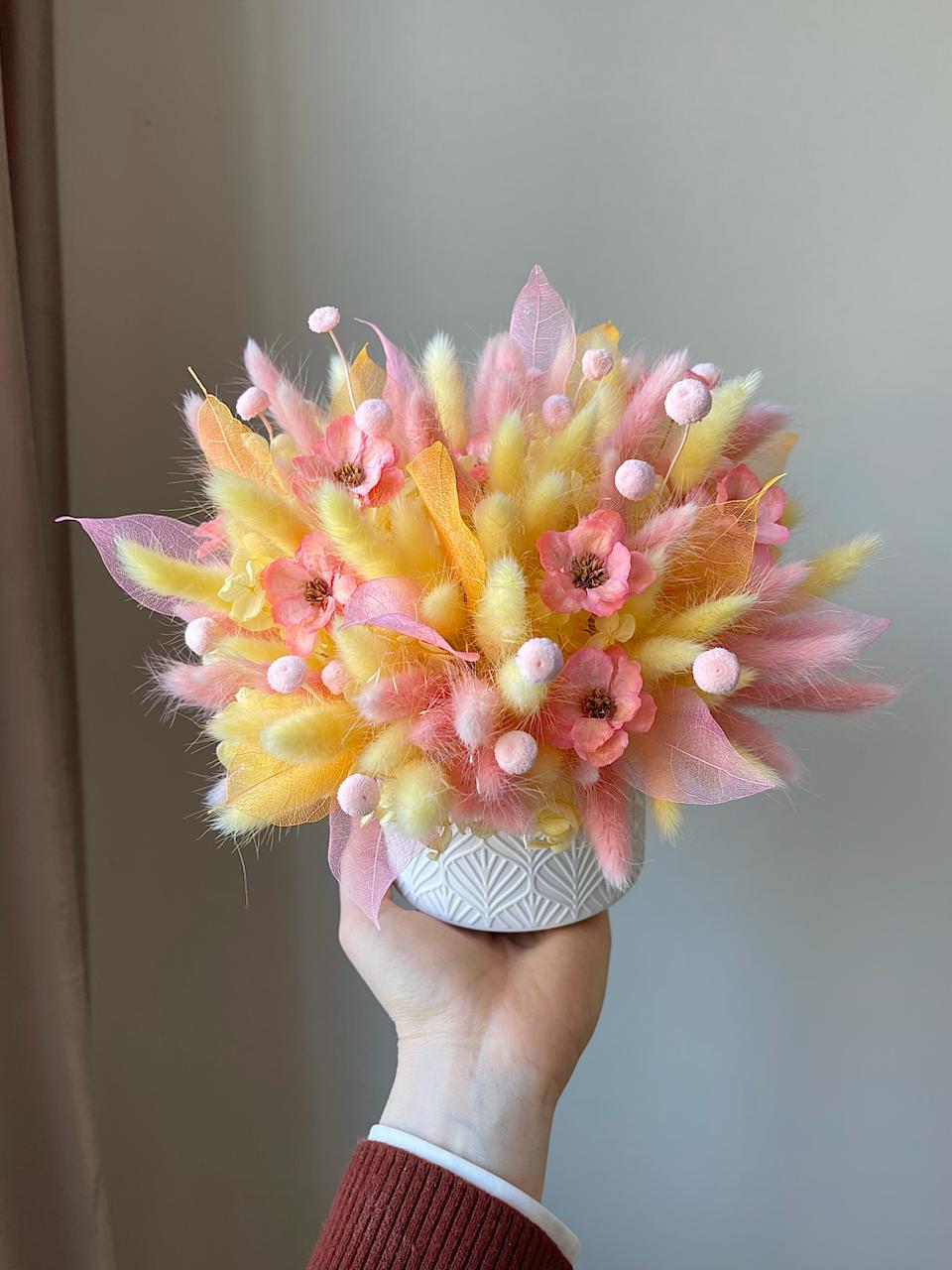 Композиция из сухоцветов - отличный вариант для декора любого пространства, будь то дом или рабочее место. Мы с радостью учтем все Ваши пожелания и соберем композицию, которая долго будет радовать Вас