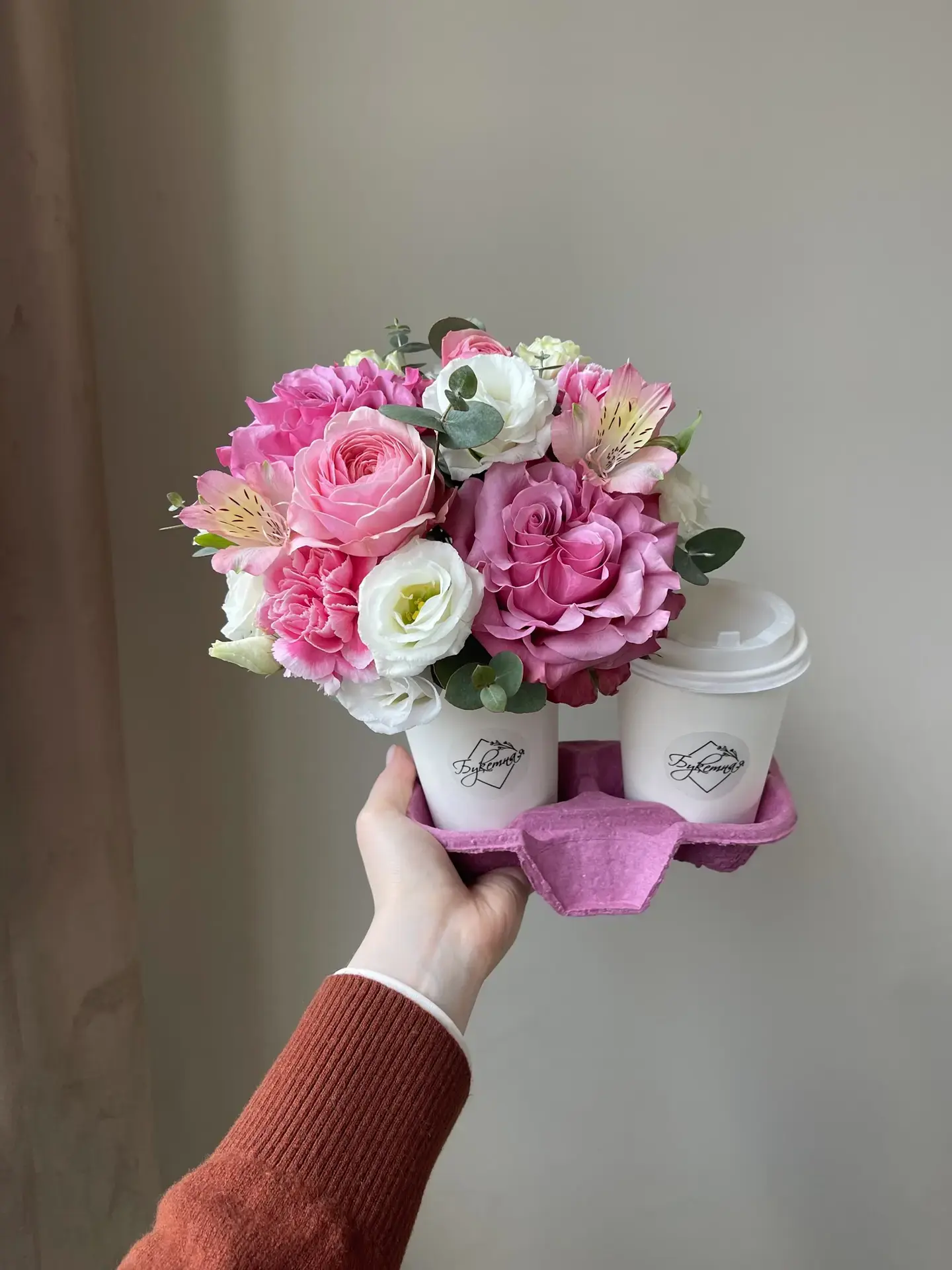 В состав набора входят цветочный стаканчик (кустовая и одноголовая роза, эвкалипт, эустома, диантус, альстромерия) + свежесваренный кофе, 2 пакетика сахара, палочка для размешивания